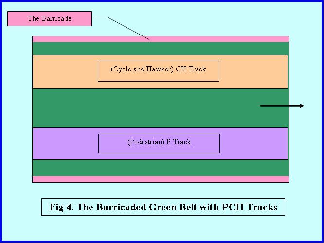 The baricated Green belt with Pedestrian, Cyclists and Hawkers [PCH] Track.